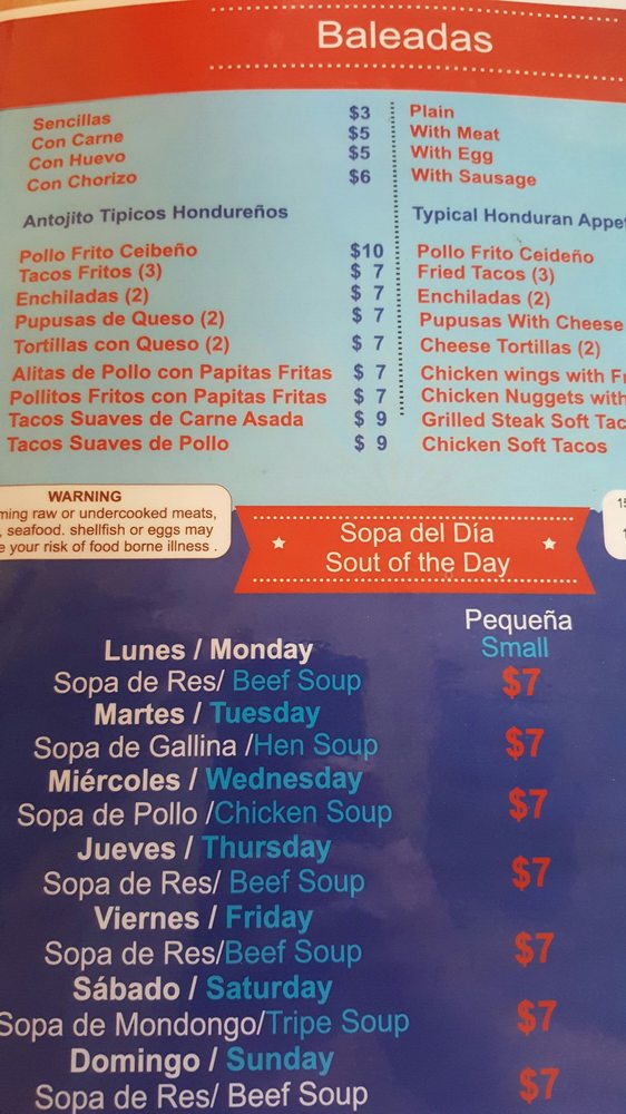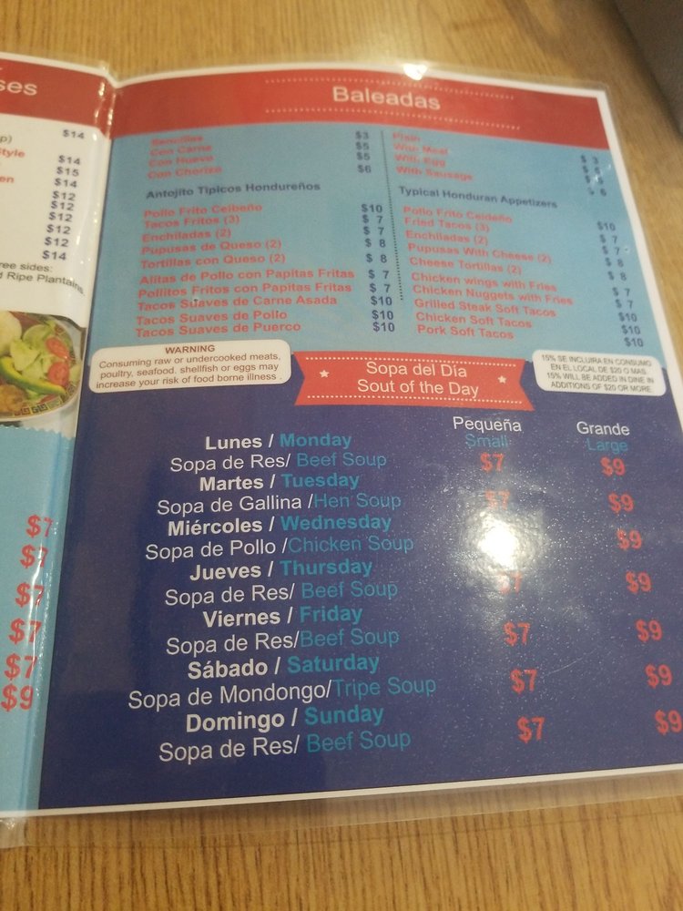 Honduran beef soup made with beef and vegetables such as corn, carrots, cabbage and potatoes. Rice and a tortilla included as a side / Sopa de carne hondurea elaborada con carne de res y verduras como maz, zanahoria, repollo y papa. Arroz y tortilla incluidos como acompaamiento.